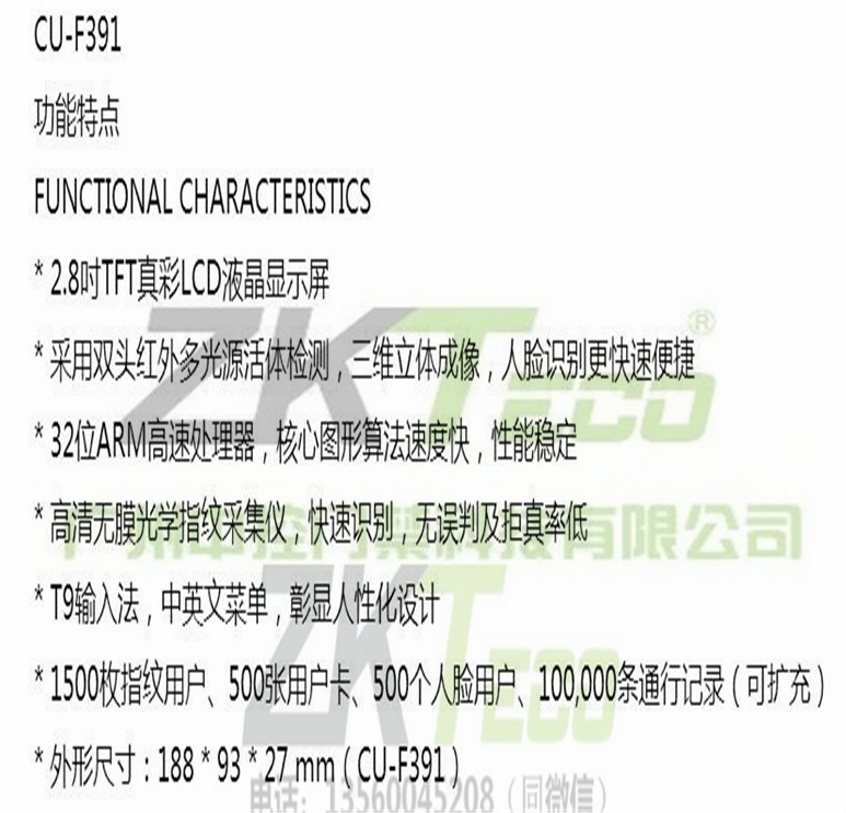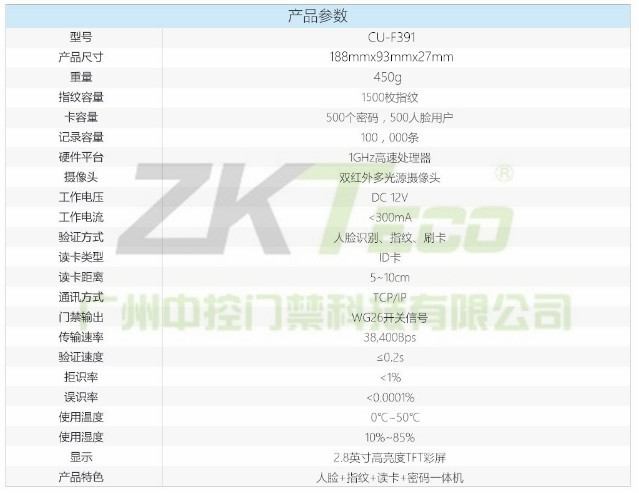 中控人臉識(shí)別指紋門禁考勤系統(tǒng)CU-F391